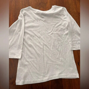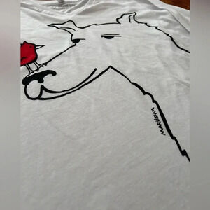 Uniques hand printed tee shirt in NWOT condition, no tears or stains. Never worn. 1/2 length sleeves. White background, with black drawing and red bird. Super cute for layering or for a statement tee.