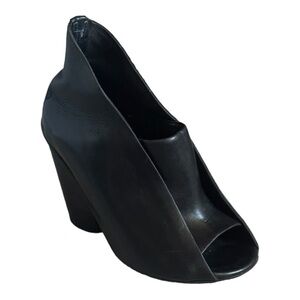Elevate your footwear collection with these sculptural Marsèll Bolla black leather ankle booties. Crafted in Italy from soft, high-quality leather, these minimalist peep-toe heels feature a modern abstract design and a 3.5” stacked wooden heel.