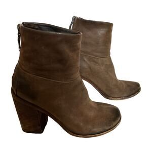 Elevate your shoe collection with these Marsèll chocolate brown leather ankle booties. The minimalist design features a sleek block heel, perfect for any occasion. The ankle shaft style adds an edge to any outfit, while the premium leather upper material ensures long-lasting durability. These boots are manufactured to look distressed.The booties are versatile and can easily be paired with a variety of outfits. Add these to your collection today for a touch of sophistication and style.