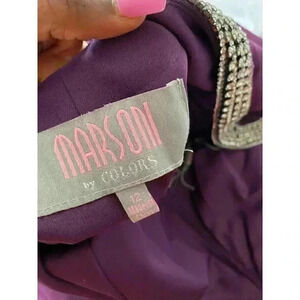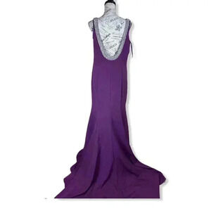 Boat Neckline- shoulders straps embellished-mermaid dress- built in cup- side hidden zip closure- Straight-Across Open Back, Seams, Sweep Train- color: dark purple- polyester- spot clean only