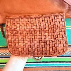 Marta Ponti Cognac Brown Leather Basketweave Satchel Handbag with Brass Hardware