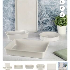 Set includes: One 15in Cookie sheet, one 13in rectangular bake pan, 8in round cake pan, one 9x5in loaf pan