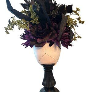 The Martha Stewart Floral Arrangement Skull Pedestal is a Halloween-themed decorative item by Martha Stewart, featuring a skull as a pedestal to hold a floral arrangement, with Gothic or dark floral elements..