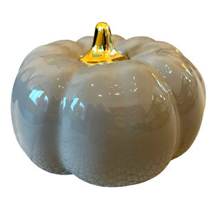 Light taupe ceramic pumpkin with gold stem and gold lettering