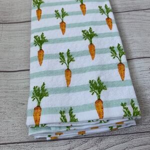 Hand towel set with mint green stripes and an orange and green carrot pattern. This set of 2 towels is printed with the pattern is on one side. The back side is white. They are perfect for the Easter and spring season!