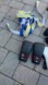 Complete martial arts gear set including gloves, belts, and protective equipment. Features black and white gloves, multicolored belts, and black protective gear.