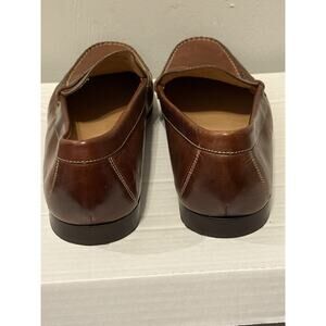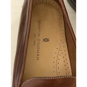 The Martin Dingman Brown Leather Penny Loafers are a stylish and comfortable option for men in the US size 11.5. Made in Brazil, these slip-on shoes feature an almond toe shape and solid brown color with logo accents, making them suitable for various occasions such as travel and casual wear. The leather outsole and insole provide arch support and comfort, while the vintage-inspired design adds a touch of preppy style. Perfect for all seasons, these loafers offer a classic and versatile addition to any man's wardrobe. The loafers are in good pre-owned condition. Please see all of the photos for more details.