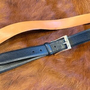 Elegant leather belt in black and tan. Features a polished silver buckle. Ideal for versatile styling. Some minor flaws but it’s well made and the leather is so soft.