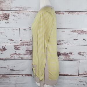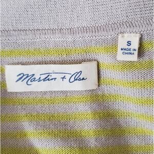 Martin + Osa yellow and grey striped boyfriend/grandpa long cardigan. Grey trim with large buttons, grey ribbed paneling on the sides and 2 front pockets. Material tag is missing but this feels like a very soft cotton or silk blend. Thin/lightweight. Very good preowned condition, Size: Small