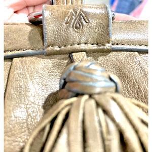 This Martin & Osa top handle bag features a chic fawn brown distressed leather exterior with thick tassel and o-ring buckle accent. Perfect casual purse with great luxury Boho vibes - think festivals and markets - cotton lined interior and magnetic clasp on the leather covered frame. The top loop handle threads through the o-ring buckle and provides a comfortable and effortless way to carry this cute purse. In overall excellent condition - super soft leather - fantastic go-with-everything color. Size: The body of this purse is approximately 8" tall x 9" across x 3" front to back / wrist strap drops the bag about 6" Check out our huge selection of vintage and chic thrift treasures - bundle your purchases and save on combined shipping! Questions, please ask. Thank you for looking! Purchasing from us? Wonderful! We take great care in preparing your selection for shipment. We ship USPS only - tracking is provided. Please check out our other items and be sure to add us to your favorites list!