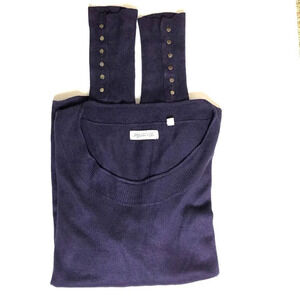 This sweater is a beautiful purple color. It has unique SIX (!) button cuffs. Crew Neck.