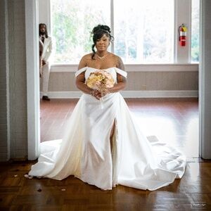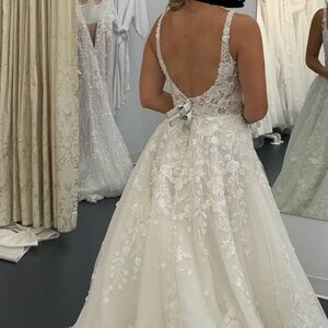 Gorgeous beaded and floral ivory wedding dress with big skirt and train. Top portion is a beautifully cut neck line with tank top sleeves. Back is adjustable corset tie, so no matter your size it will fit you.
