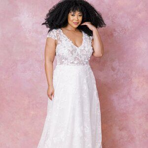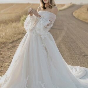 Could come with tulle plain veil and see through long sleeves that could attach to the dress. Two different types of sleeves available