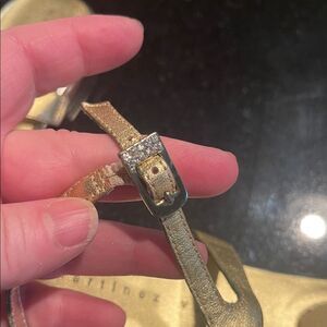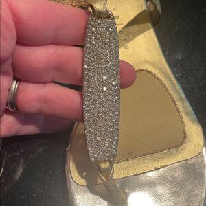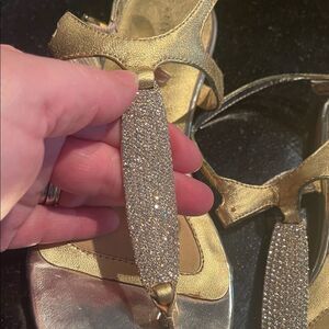 Elegant sandals with gold straps and silver accents. Perfect for a glamorous look.
