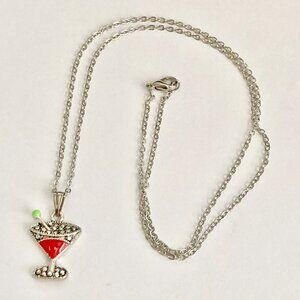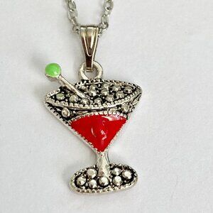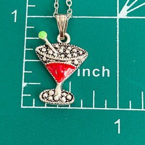 Martini Cocktail Drink Cup Glass Charm Necklace Pendant Red Enamel 18" Chain
