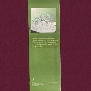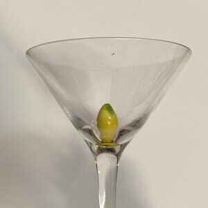 Set of 8 handmade martini glasses with fruit accents (green olive, lemon, orange, green apple) by Potpourri Designs. Glasses hold about 8 ounces each