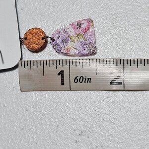 These elegant dangle earrings feature floral prints with wooden glitter accents, perfect for complementing a variety of outfits. Designed with a hook closure for easy wear.