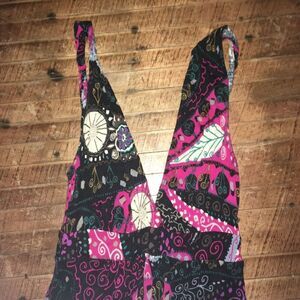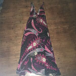Knit, deep v-neck, tropical maxi dress. Travels well. Cute paired with a jacket and your favorite sandals. Approximately 14 inches from armpit to armpit, 14 inches across the waist, 60+ inches long. From a pet and smoke free house. Happy to bundle!
