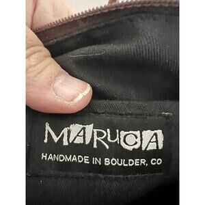 Handmade Maruca Design crossbody purse featuring a retro circle pattern in mustard yellow, plum, and gray with a burgundy striped top panel. Crafted in Boulder, Colorado using Maruca’s signature woven jacquard fabric. Brass-tone zipper pulls and a soft faux-suede strap add rustic charm. Fully lined interior.