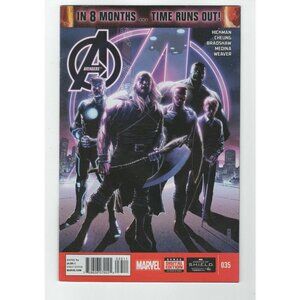 Marvel Avengers #35 2014 comic, In 8 Months Time Runs Out comic, Jonathan Hickman Avengers comic, Jim Cheung Avengers art, Time Runs Out event comic, Secret Wars tie-in comic, bonus digital edition comic, Rated T+ Marvel comic, Illuminati Avengers clash comic, 32-page full-color comic, Hickman Marvel saga comic, Marvel collectible comic, comic book gift, store cool dry comic, avoid sunlight comic,