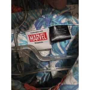 This is a Marvel Avengers Hawaiian print button-up shirt for men in size small. It features short sleeves, a collared neckline with a button-down style, and a blue color with a floral pattern. Made of cotton, this casual shirt is machine washable and perfect for summer, fall, and spring occasions. The design includes characters like Thor, Iron Man, Spider-Man, and The Hulk, making it a fun choice for Marvel fans.