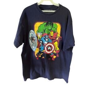 Marvel shirt, Avengers t-shirt, Captain America tee, Hulk shirt, Thor graphic tee, Iron Man shirt, superhero t-shirt, Marvel comics shirt, men’s size large, navy blue graphic tee, Marvel fan apparel, retro superhero shirt