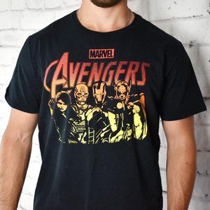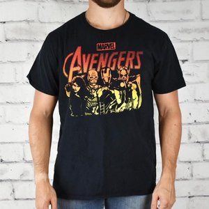 Super dope officially licensed Marvel Avengers graphic t-shirt features full front graphic with Captain America, Ironman, Thor, and Black Widow in ombre screen print. Minor cracking on screen print adds character to this sweet piece. Very slight fading from wash and wear.