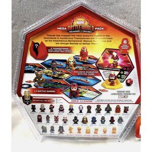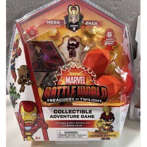 Mega Pack Series 2 features (per packaging): 6 Hero Movers inside, 13 Battle Cards, 2 Thanostones, and an exclusive Captain Marvel character with foil card