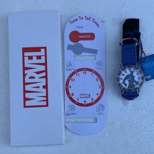 Children can learn to tell time with this Time Teacher Watch from Marvel. The dial features the Black Panther. The hands are labeled with "Hour" and "Minute." The watch has a 16mm blue nylon strap and a 32mm plastic case. Mineral glass crystal. Stainless steel case back. Hook and loop clasp, Japan quartz movement.