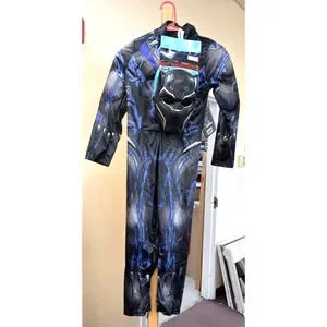 The Marvel Black Panther Light-Up Costume for Boys in size 9/10 is a complete outfit featuring a Black Panther theme, made of polyester material with elastic/stretch for easy movement. The costume includes a black jumpsuit with multi-color accents, a unique design element that sets it apart from other superhero costumes. This officially licensed product by Disney is perfect for young fans of the Black Panther franchise, adding a fun and interactive element with the light-up feature. Made in China, this costume is sure to thrill and entertain any young superhero fan.