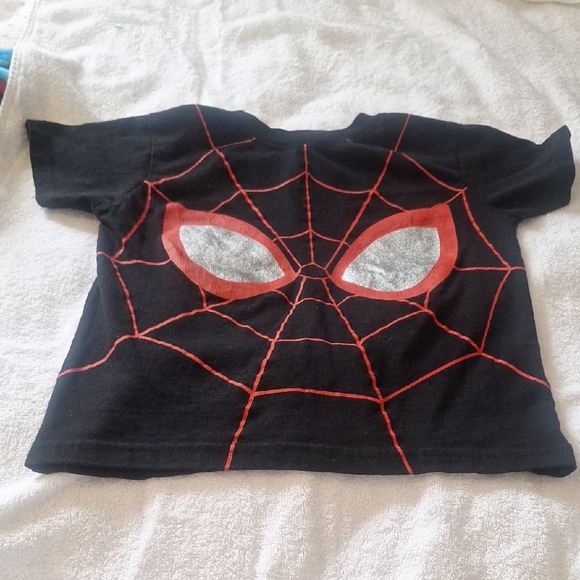 Marvel superhero shirt with bold spider web design. Features black and red colors. Ideal for playtime and dress-up.