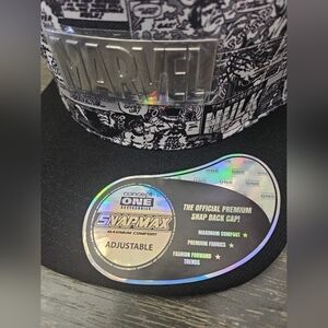 Marvel snapback cap with a black and white comic design. Front logo still wrapped in protective film. Features an adjustable fit.