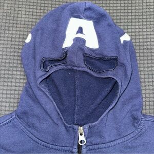 Marvel hoodie with striking star design. Features blue, red, and white colors. Ideal for fans.