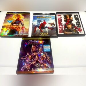 Marvel Bundle UV HDR Blu-Ray, DVD, & Digital Code Combo Packs. Includes Captain Marvel, Spiderman Homecoming, Deadpool 2, & Avengers Endgame.