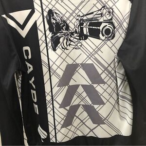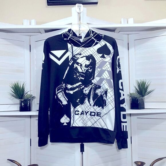 Cayde Marvel dark character skull black and white long-sleeve hoodie, size small, for Halloween cosplay.