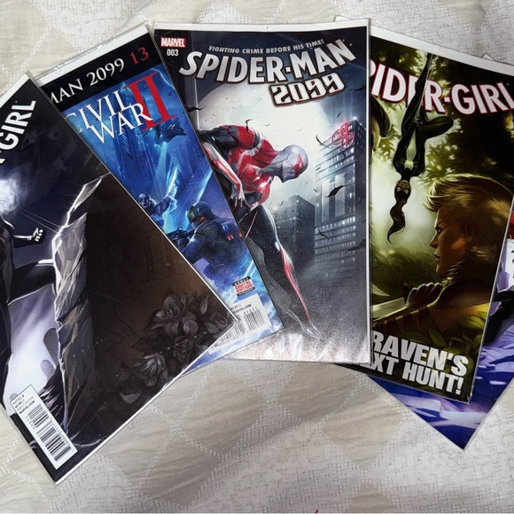 Set of Marvel comic books featuring Spider-Man and Spider-Girl. Vibrant covers with red, blue, and black tones.