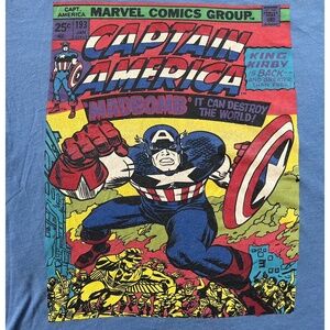 🔖 Tags: Marvel Comics Tee, Vintage Captain America Shirt, Jack Kirby Graphic T-Shirt, Retro Marvel Apparel, Blue Crewneck Tee, Men's Marvel Shirt, 1976 Captain America Design, Silver Age Marvel Collectibles, Marvel Fan Clothing.