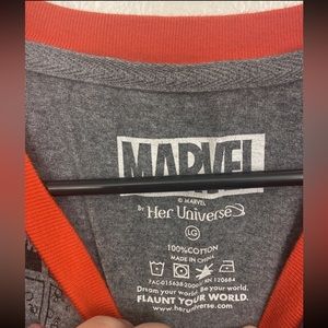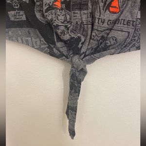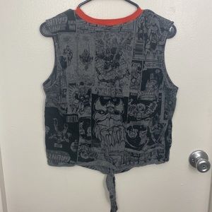 Large Marvel Comics tank top with a cute tie at the bottom.
