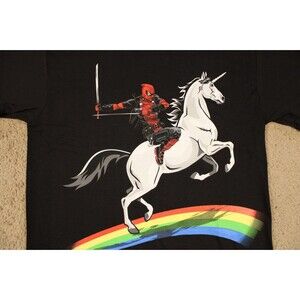 Marvel Deadpool Riding Unicorn Rainbow Graphic Tee (SM) Black Cotton Licensed