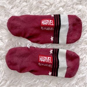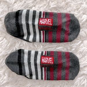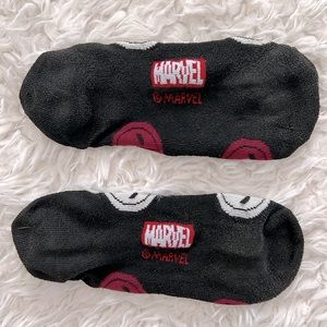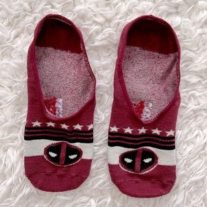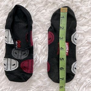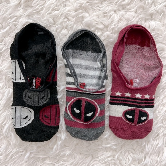 3 pairs of Marvel Deadpool no show socks. They all have some wear but no holes or rips.