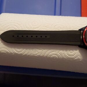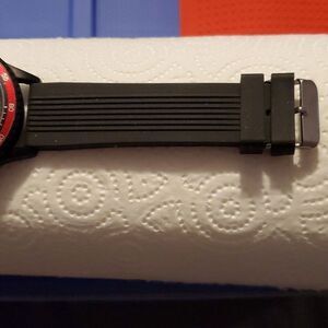 Black & red case, black, red & white face, silver quarter hour numerals, black band & silver hardware.