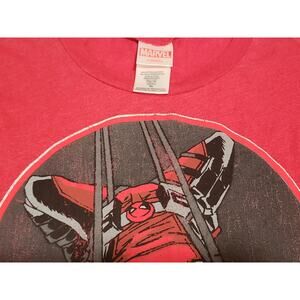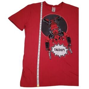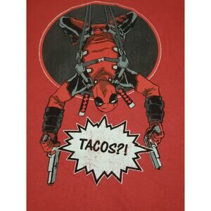 Marvel Graphic Deadpool "Tacos?!" Red Short Sleeved Shirt. Preloved condition with signs of wear, the White in the Taco is started to fade as shown in the picture.