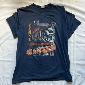 Show off your love for the Marvel universe with this Guardians of the Galaxy Star-Lord “Wanted” graphic t-shirt. Made from soft cotton fabric in classic black, this tee features bold, detailed artwork of Star-Lord — perfect for fans of the hit Marvel series.