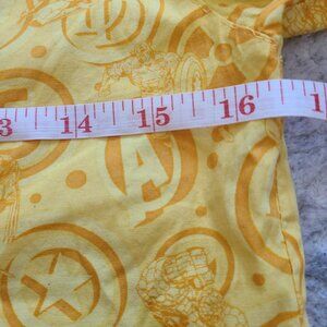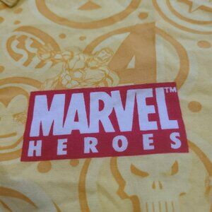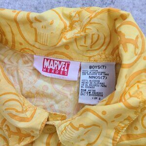 Bright yellow Marvel Heroes short sleeve button-up shirt featuring Spider-Man, Iron Man, Captain America, The Thing, and Wolverine across the hem. All-over comic symbol print with a red Marvel logo patch on the chest.