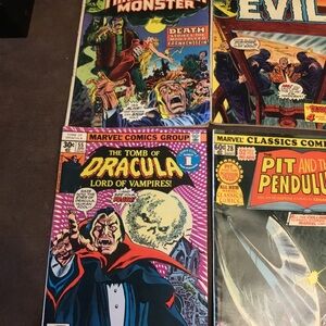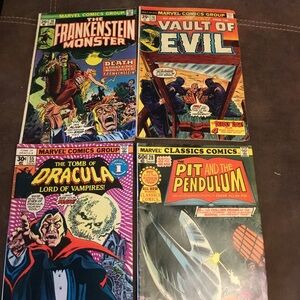 Marvel horror comics featuring Frankenstein, Vault of Evil, Dracula, and The Pit and the Pendulum. Bold and colorful covers.