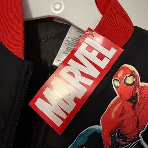 Vibrant Spider-Man jacket for kids. Features bold black and red design. Includes iconic Spider-Man patches. Perfect for superhero adventures.
