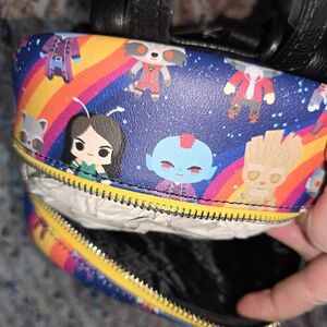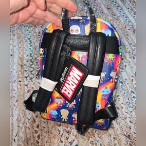 Colorful Marvel Loungefly mini backpack with character design. Features vibrant blue background with multicolor accents.