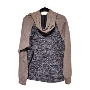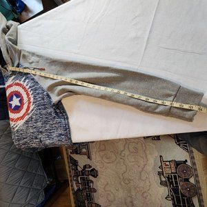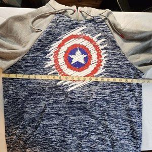 Show off your love for Captain America with this stylish Marvel Mad Engine hoodie size medium. Featuring a 3D print of Captain America's iconic logo in blue, this cozy blue gray hoodie is perfect for any season. The high neckline and long sleeves provide extra warmth, while the knit polyester fabric ensures comfort and durability. In excellent preloved condition from a smoke-free home.