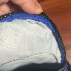 A couple minor issues as pictured, rip in the interior liner at top and hanging piece on outside has some rips.