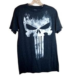 Superhero graphic tee with Marvel's comic, TV and movie Punisher skull. Dark charcoal gray/black with white and gray graphic. Unisex men's small, women's medium, youth large.